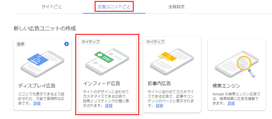 広告ユニットごとを選び、「インフィード広告」をクリックします。